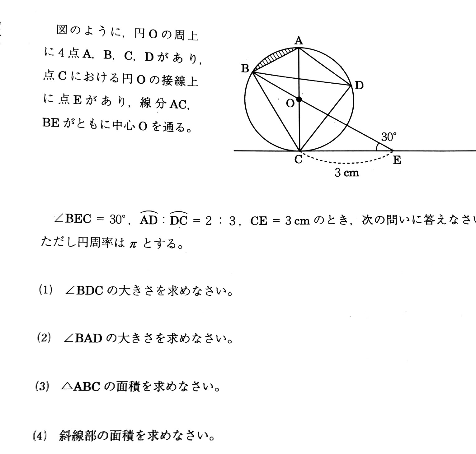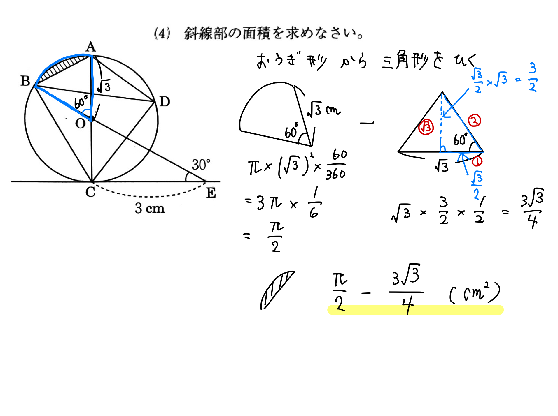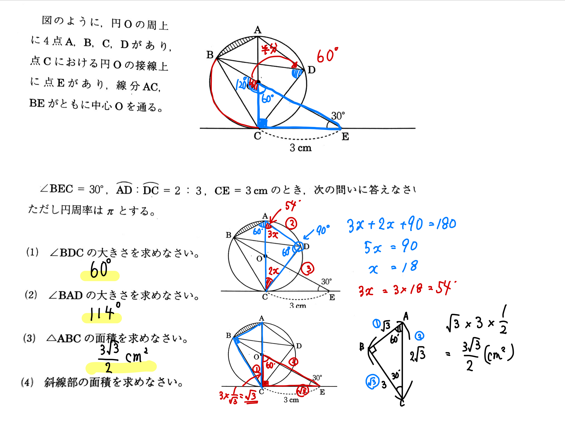 図形 図形の入試問題を解説!★★☆ kaztastudy 2020年2月13日 2020.02.14 解答 答え (1)\(60\)° (2)\(114\)° (3)\(\frac{3\sqrt{3}}{2}\)㎠ (4)\(\frac{\pi}{2}-\frac{3\sqrt{3}}{4}\)㎠ 解説① 解説②